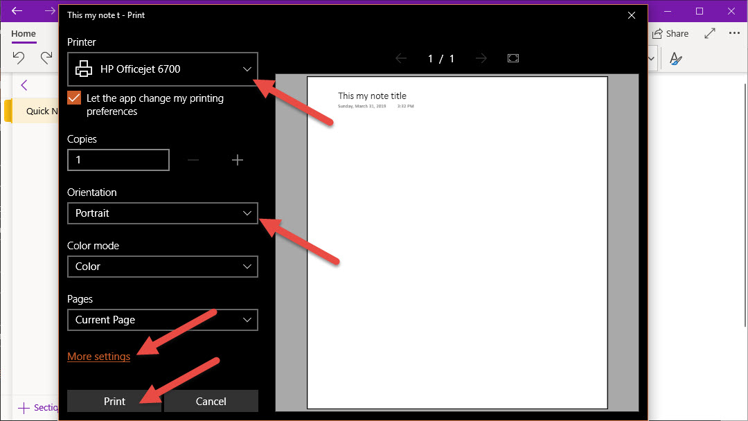 Printing OneNote notebooks is simlar to the other Office applications. From the Print Dashboard, select the printer you want to use, and configure any print settings you want to adjust.