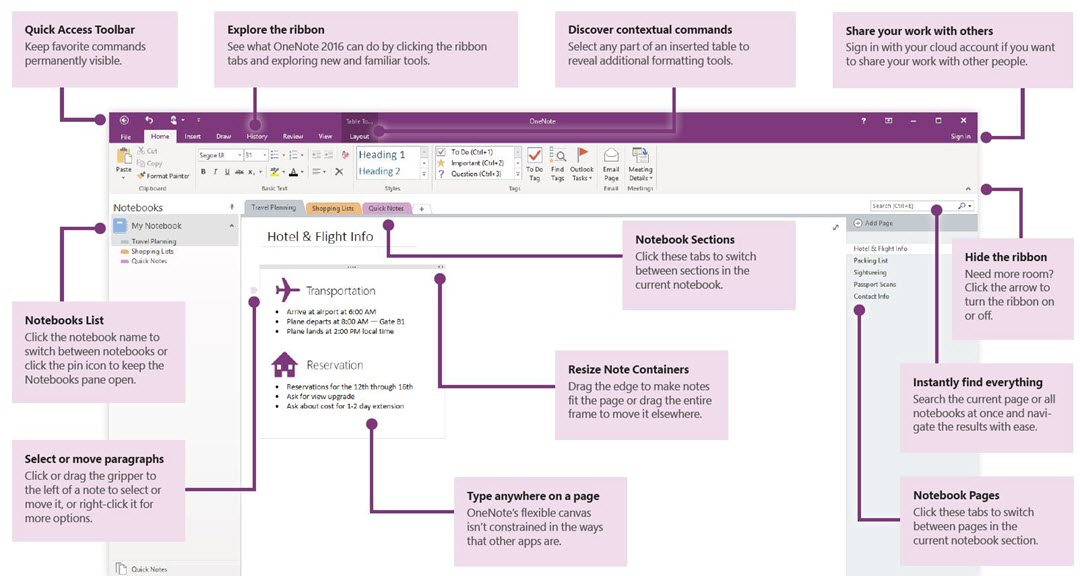 The ribbon (or dashboard) for OneNote contains all the tools you can use for note creation: