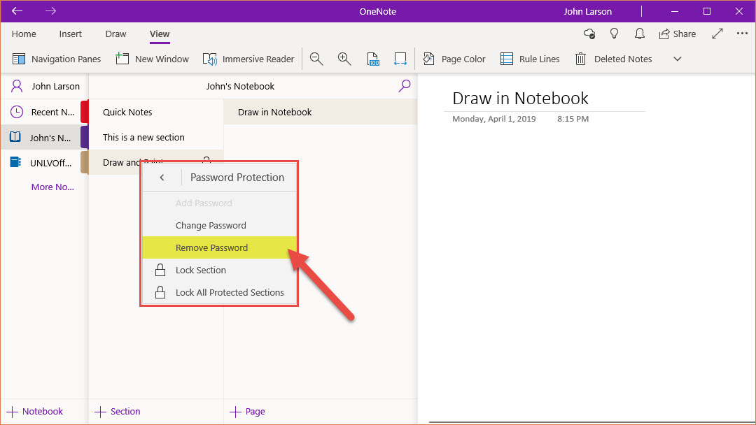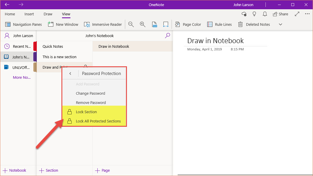 Use passwords to protect notebook sections you want to keep private.