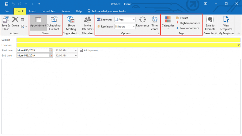 1. Choose New Appointment or open an appointment by double-clicking on the event.