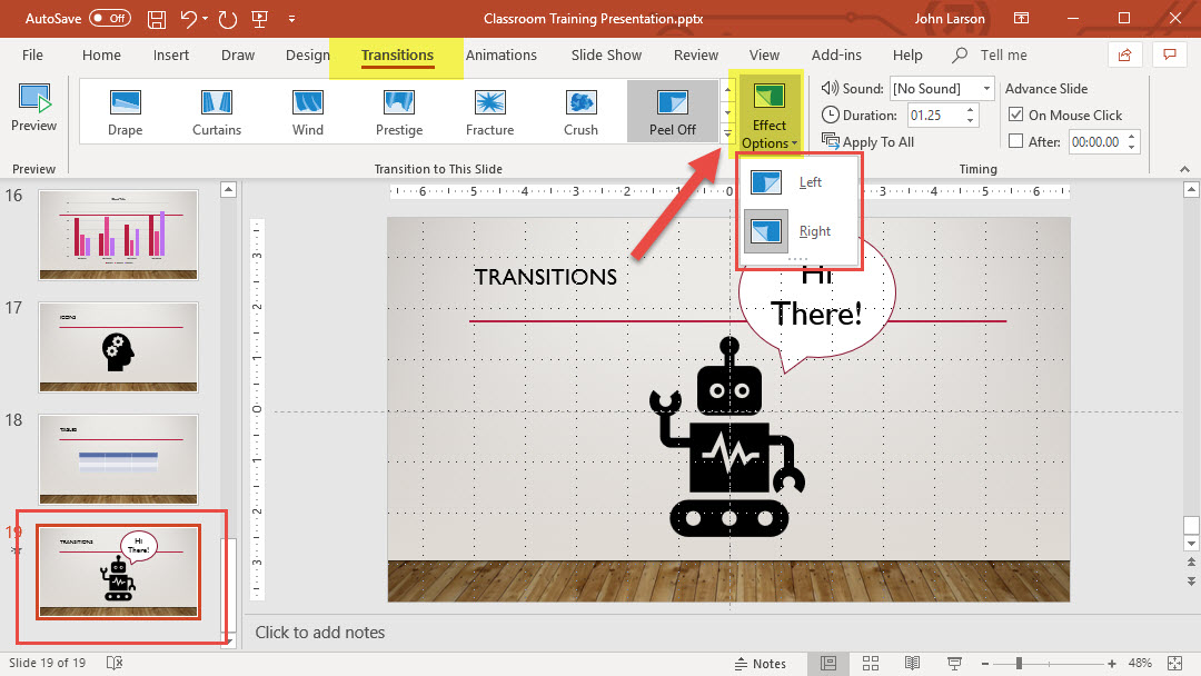 2. Select the Transitions tab and choose a transition. Select a transition to see a preview.