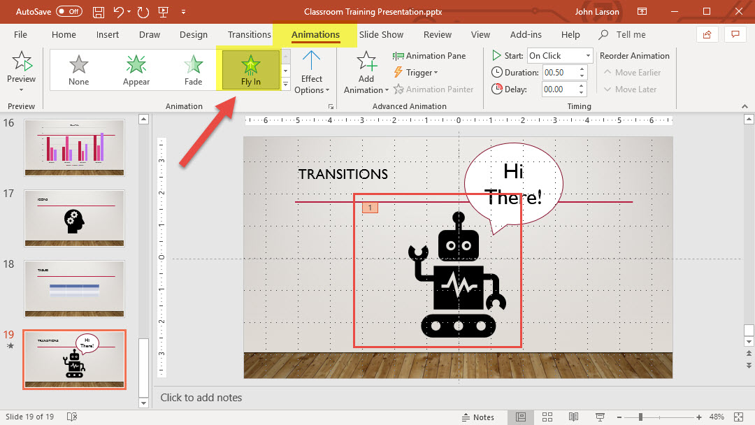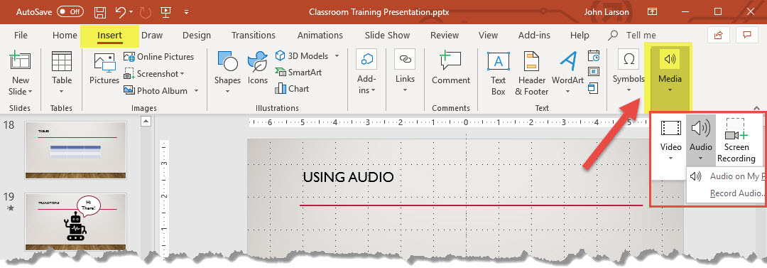 If you’re using more than one audio file per slide, we recommend putting the audio icon in the same spot on a slide to find it easily.
