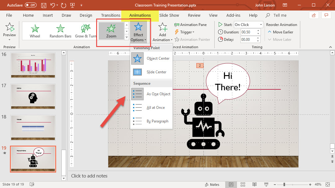 - With Previous: Play an animation at the same time as the previous animation in your sequence.