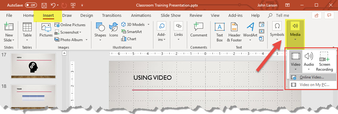 1. On the Insert tab of the ribbon, select Media > Video > Online Video (or Video on My PC).