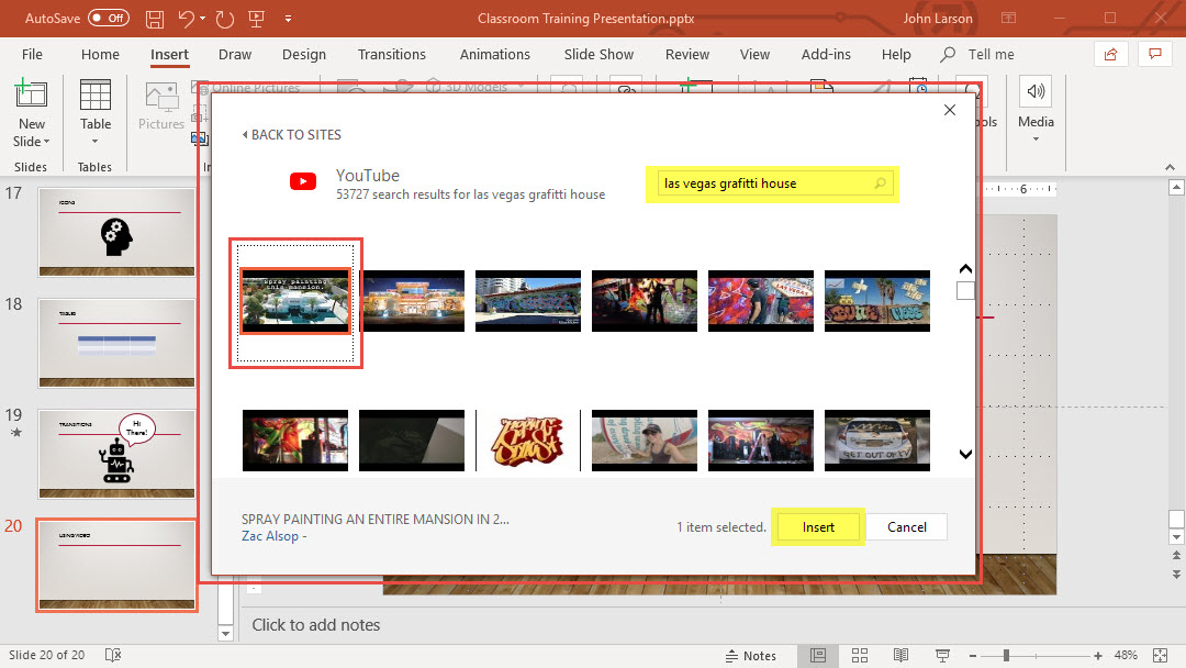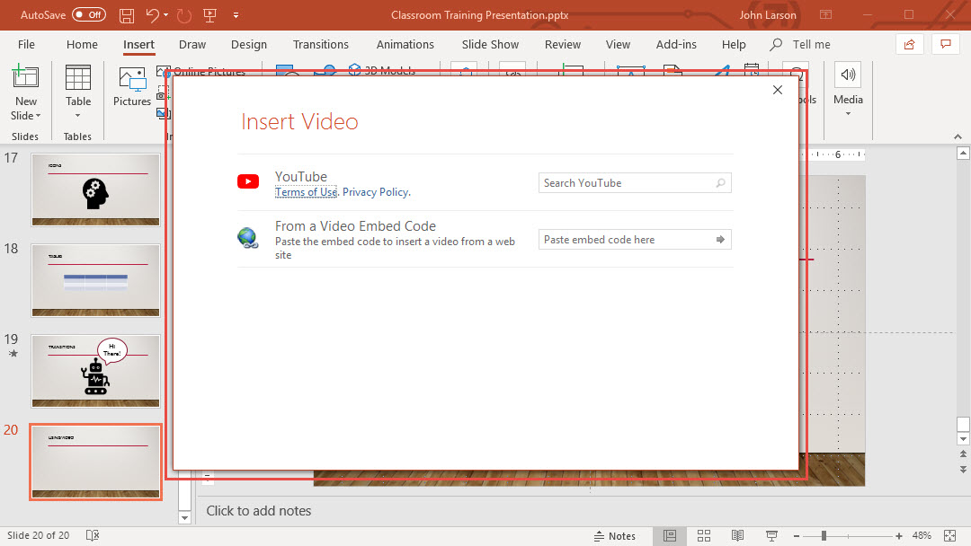In PowerPoint for Office 365 or PowerPoint 2019, you can insert an online video from YouTube or Vimeo on a slide.