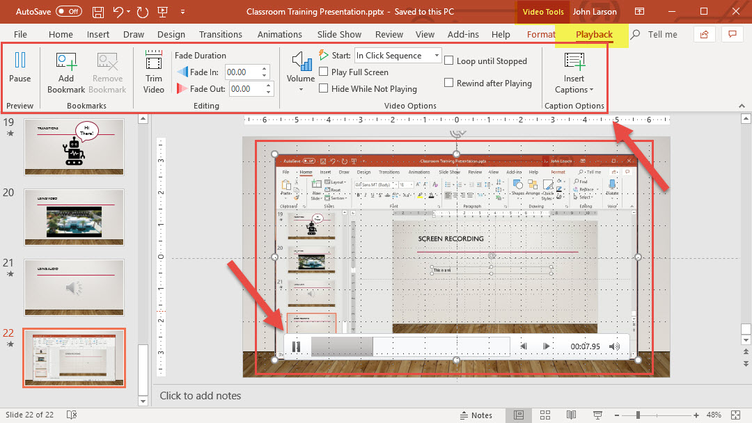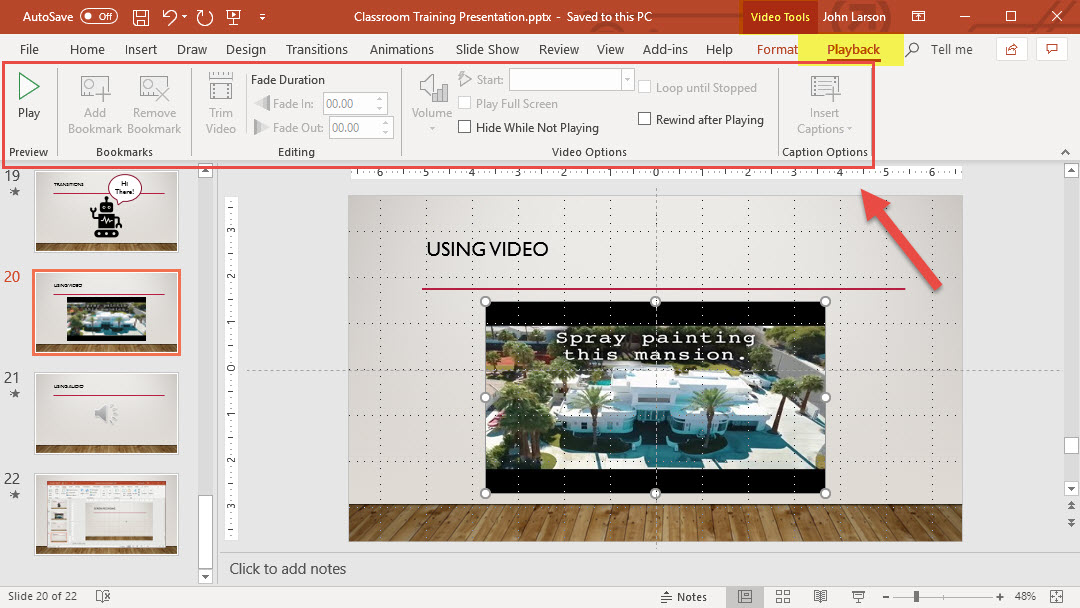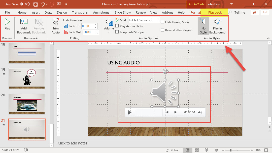 Select the audio icon and then select the Audio Tools Playback tab. Then select which options you’d like to use: