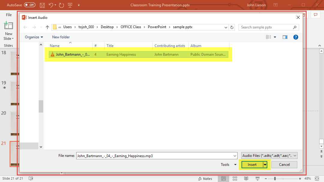 3. In the Insert Audio dialog box, select the audio file you want to add.