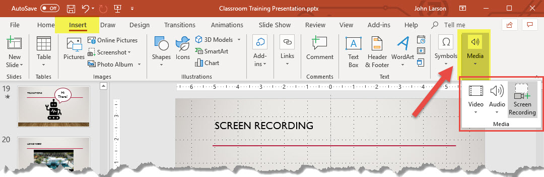 2. On the Insert tab of the ribbon, select Screen Recording.