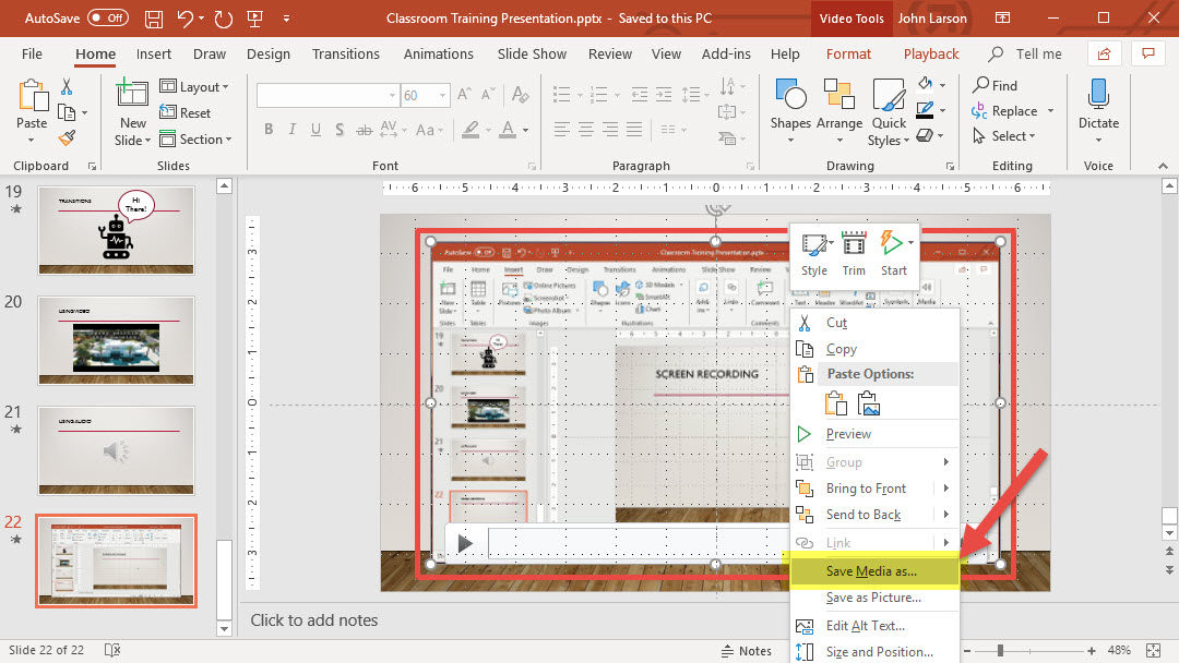 To save the recording as a separate file on your computer, right-click the picture on the slide that contains the recording, and select Save Media As. In the Save Media As dialog box, specify a file name and folder location, then click Save.