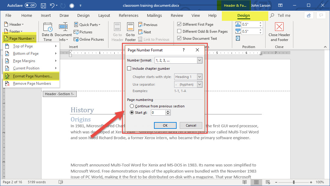 3. If you want numbering to start with 1 on the second page, go to Page Number > Format Page Numbers, and set Start at to 0.