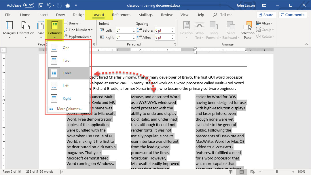 1. To lay out the whole document in columns, select Layout > Columns.