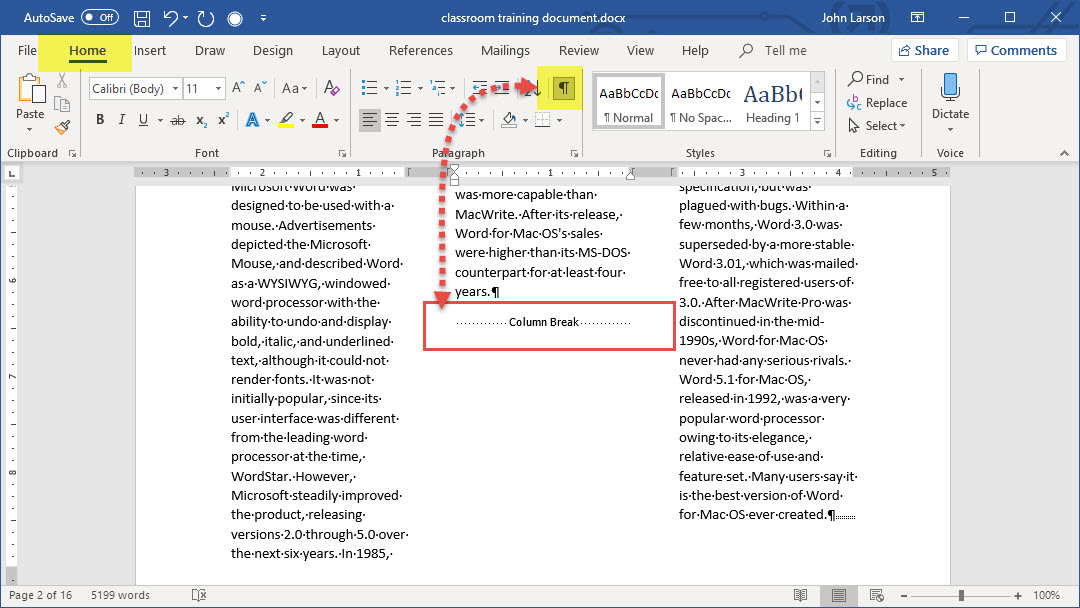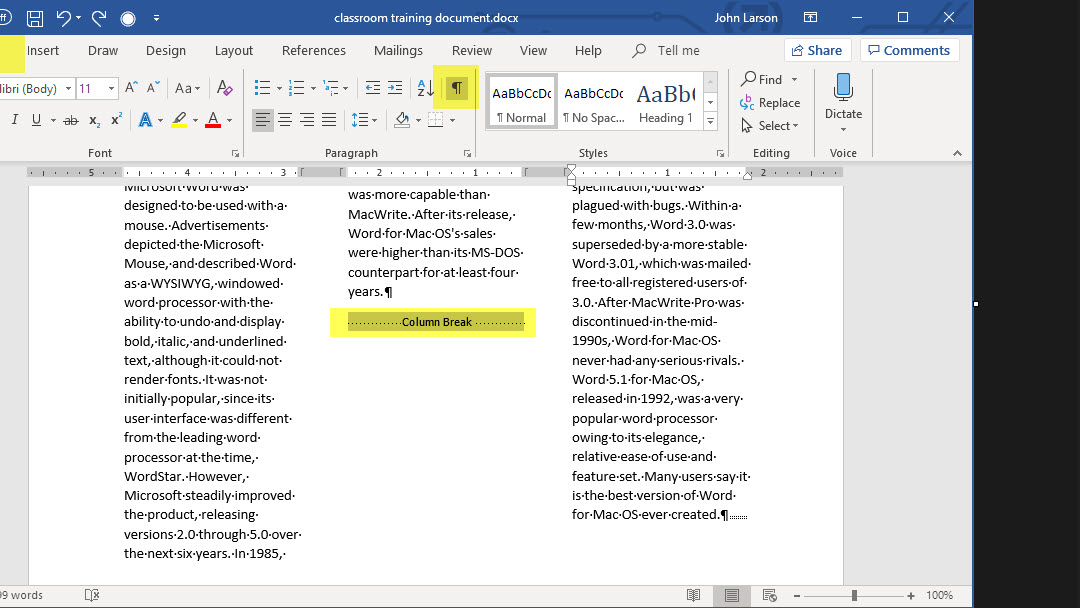4. A column break is inserted. Click Home > Show/Hide Paragraph mark to see it.