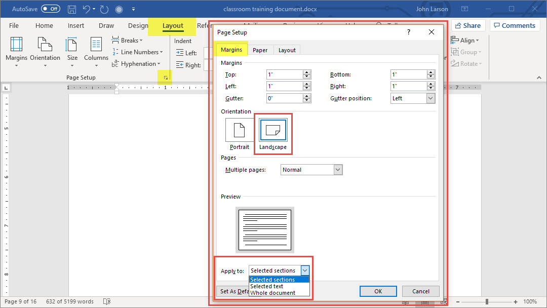3. Select Landscape, and in the Apply to box, choose Selected text.
