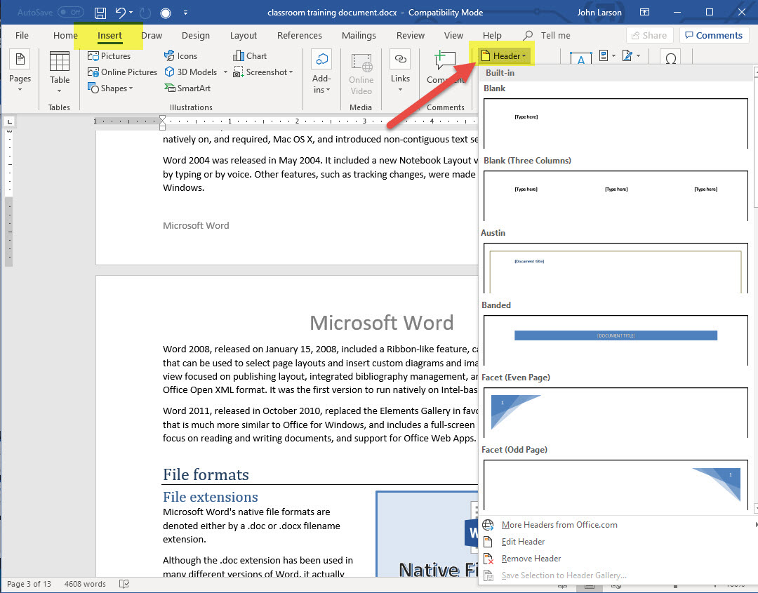 1. With your cursor on the first page of your document, go to Insert, select Header or Footer, and then pick a built-in layout and design, or select Edit Header or Edit Footer to create your own.