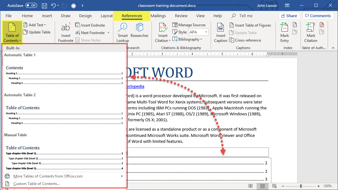 Read More: For a hands-on guide that steps you through the process of creating a table of contents, download the Table of Contents tutorial. Or, in desktop Word, go to File > New, and search for table of contents.