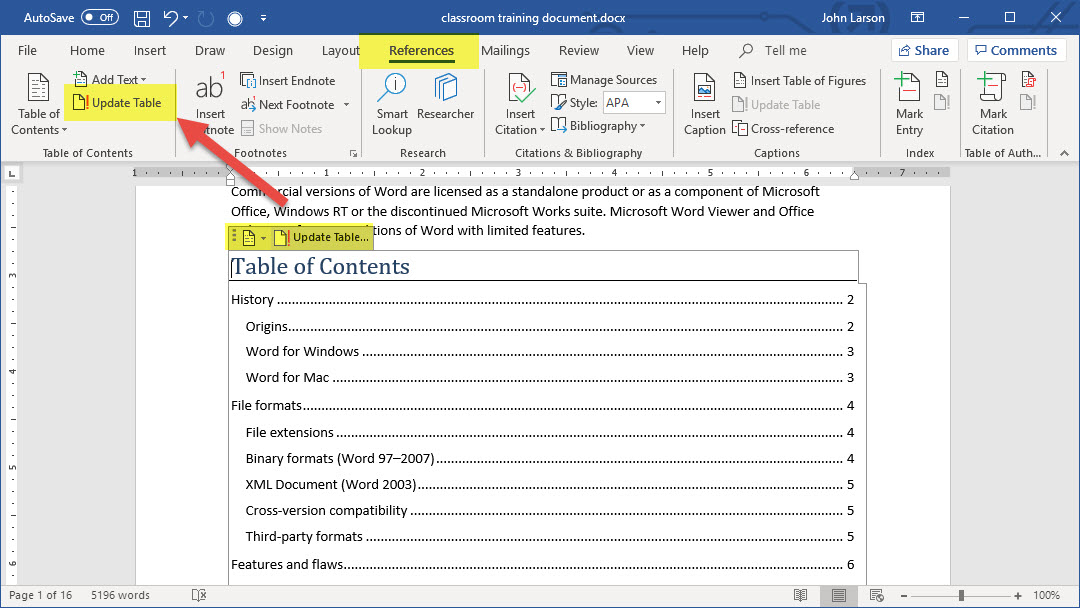 3. If you make changes to your document that affect the table of contents, update the table of contents by right-clicking the table of contents and choosing Update Field.