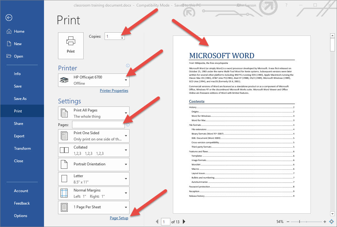 1. Select File > Print. On the right, you’ll see a preview of your document. On the left, you’ll see the Print button and the configurable Settings.