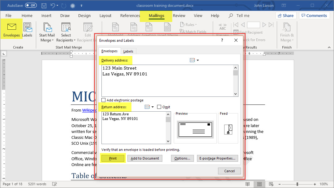 1. Go to Mailings > Envelopes, and enter delivery and return addresses.