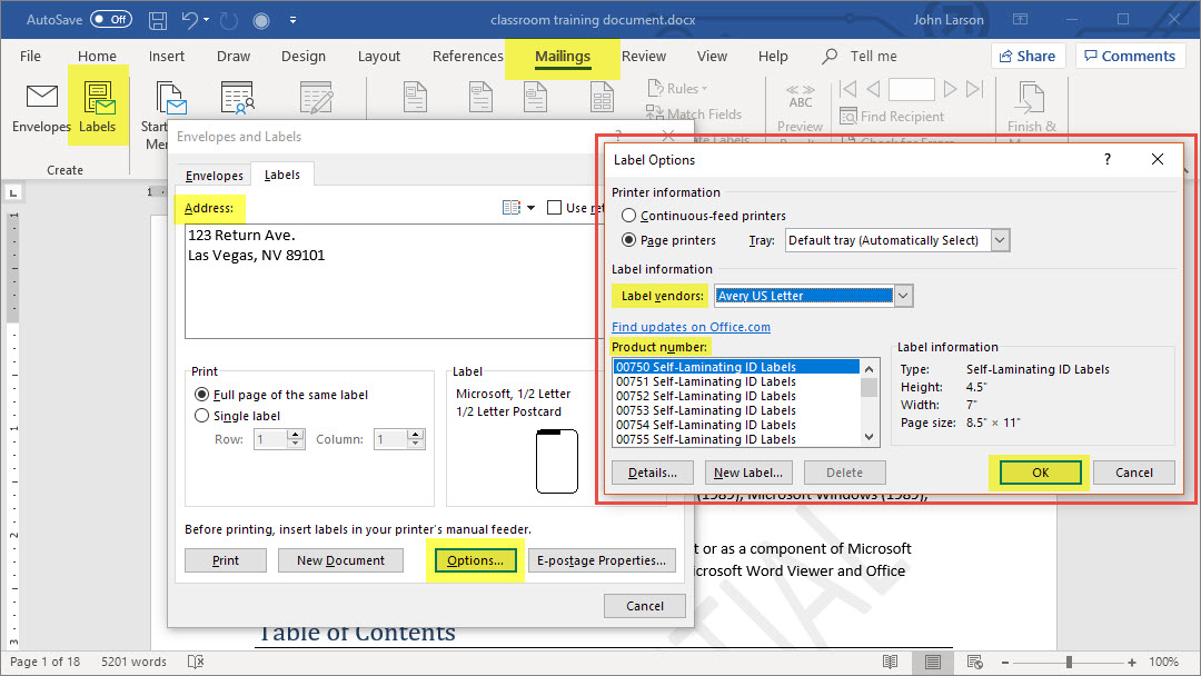 3. Select Label options, choose your Label vendor and Product number (find this on your label package), and then select OK.