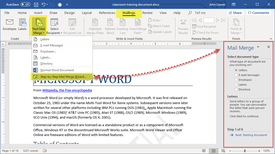 1. Go to Mailings > Start Mail Merge > Step-by-Step Mail Merge Wizard.