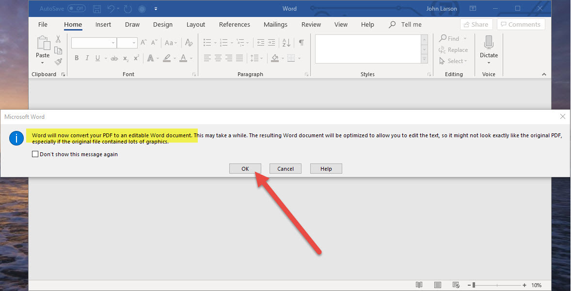 3. Word tells you that it’s going to make a copy of the PDF and convert its contents into a format that Word can display. The original PDF won’t be changed at all. Select OK.
