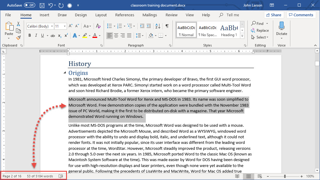 When you need to know how many words, pages, characters, paragraphs, or lines are in a document, check the status bar.