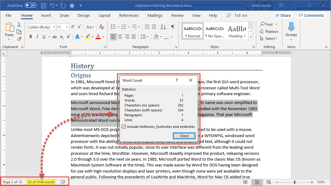 For a partial word count, select the words you want to count. The status bar shows the word count for that selection and for the entire document.