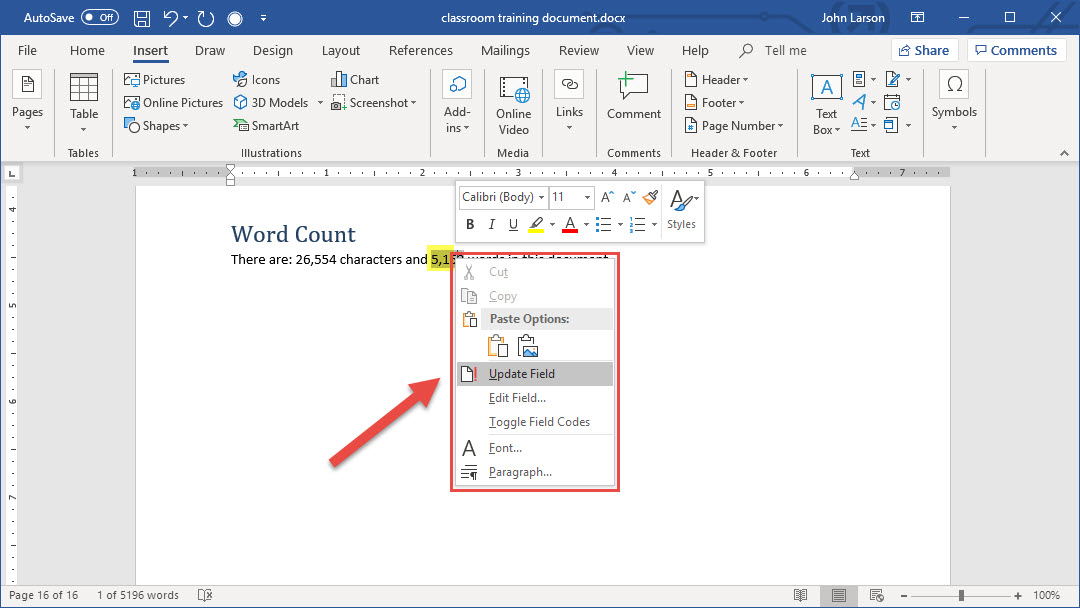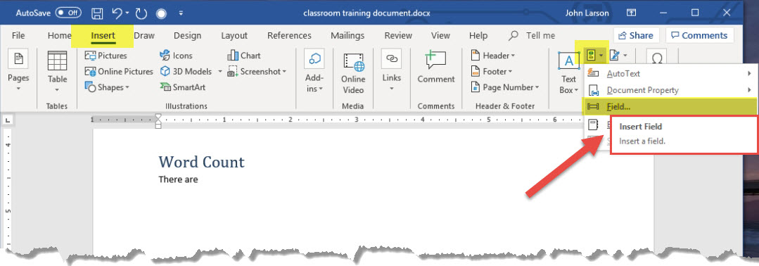 To see the word count in your document, look at the status bar at the bottom of the Word window. Word can insert the word count into your document and update that information as often as you want.