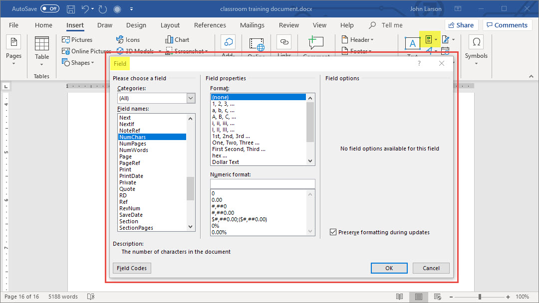 Note: You can also add the number of pages or characters by clicking NumPages or NumChars in the Field names list.