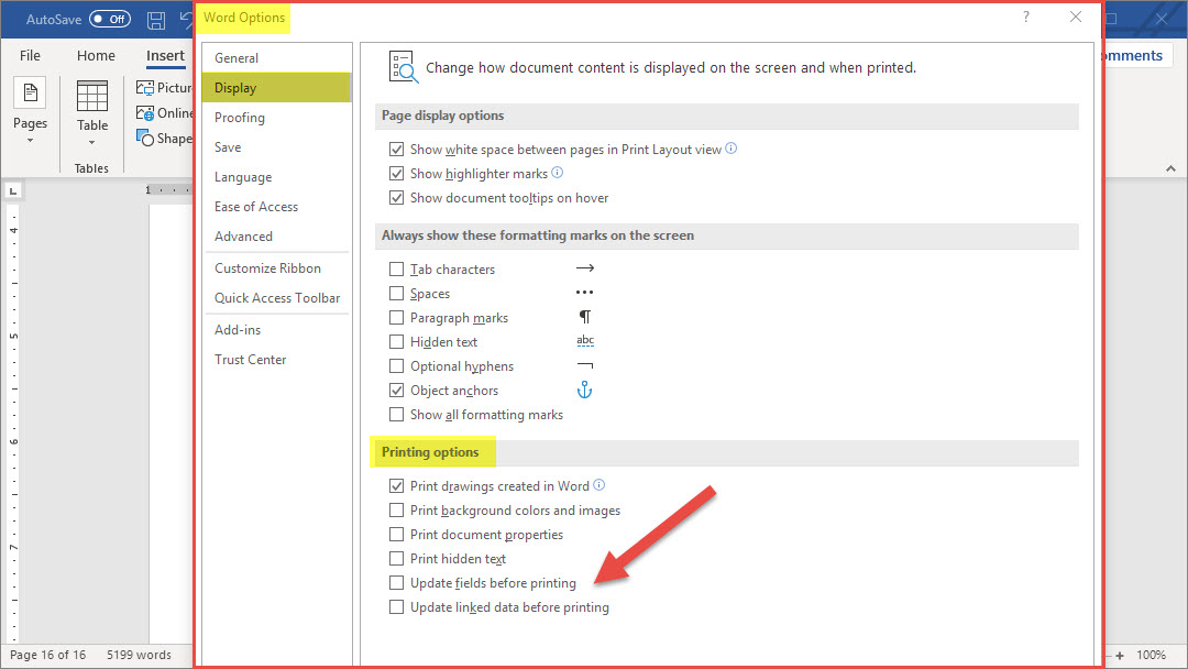 If you’d like the information to update automatically when you print, click File > Options > Display and then under Printing options select Update fields before printing.