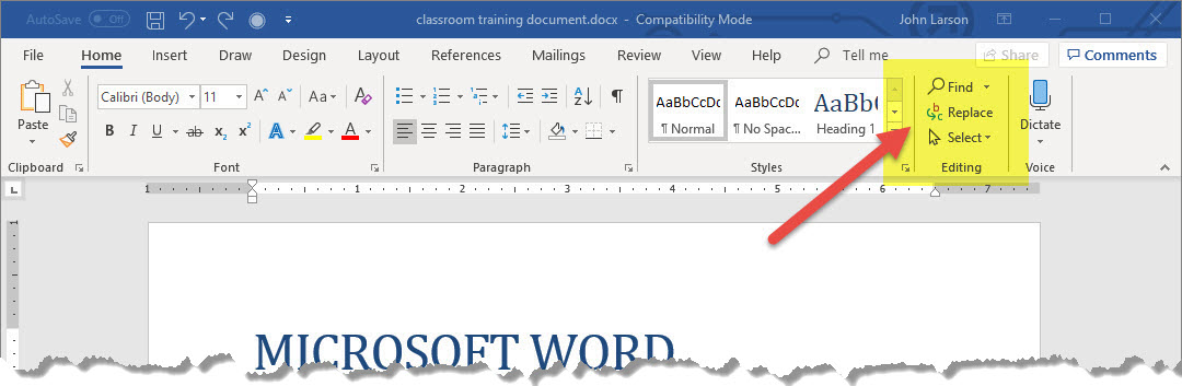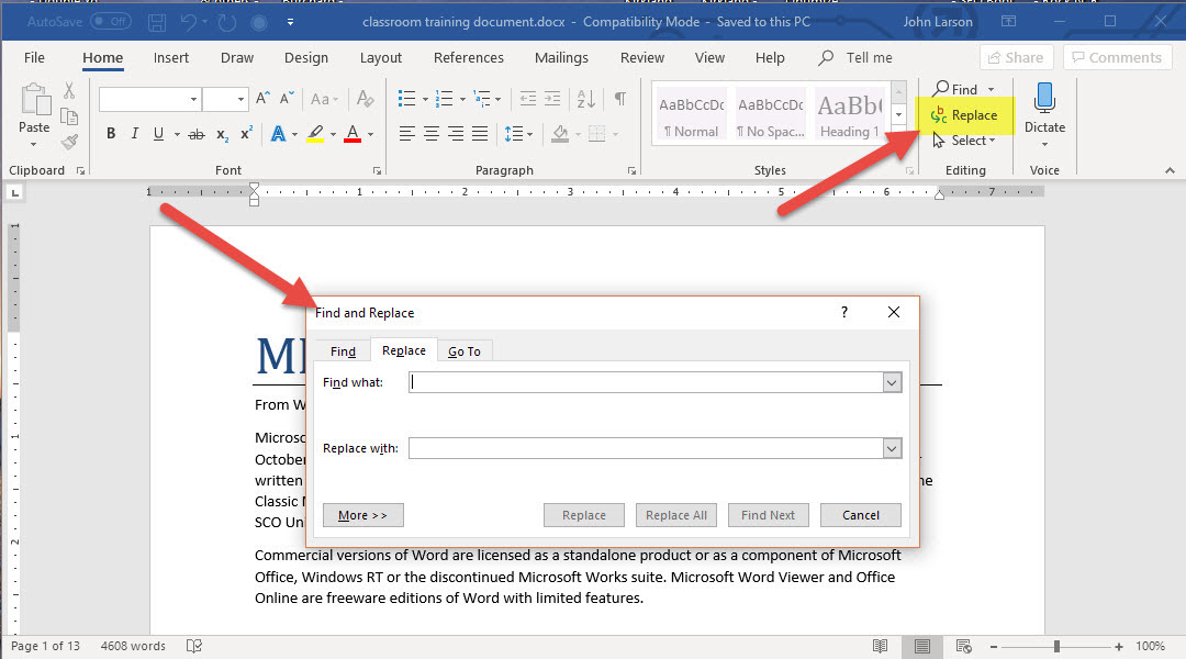 1. On the Home tab, choose Replace (or, press Ctrl+H).