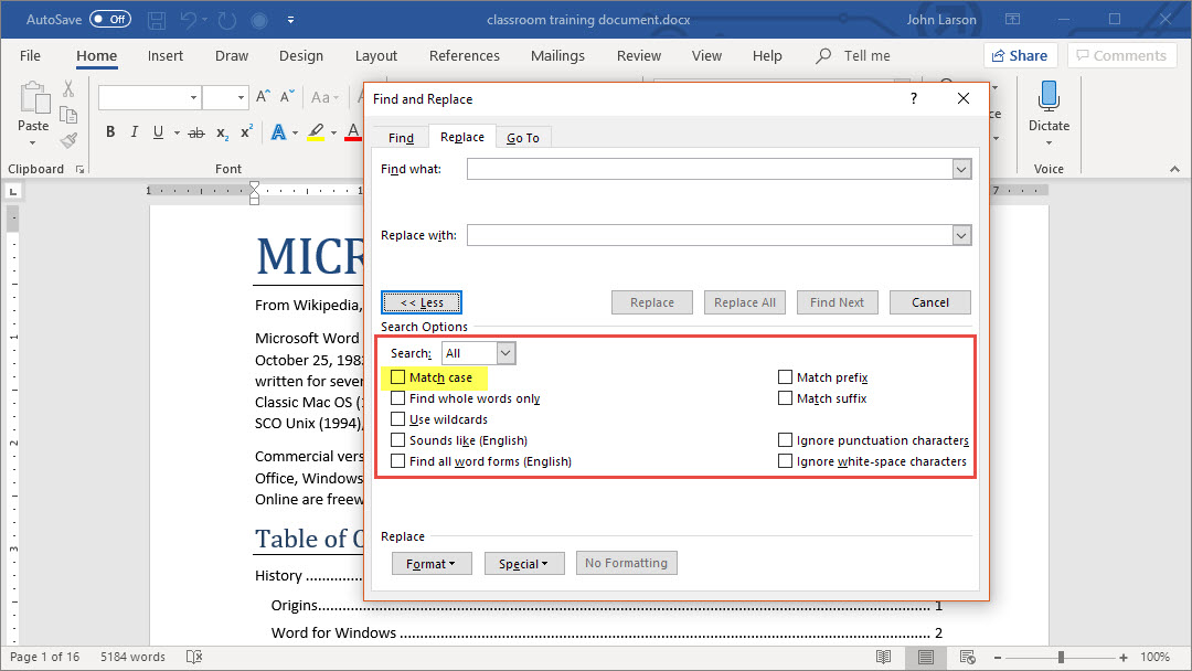 Tip: To specify only upper or lowercase in your search, select More > Match case.