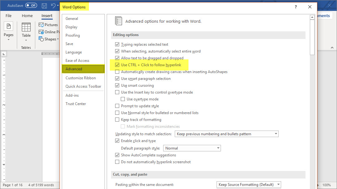 Tip: If you’d rather follow links just by clicking them, Go to File > Options > Advanced and clear the Use Ctrl+Click to follow hyperlink check box.